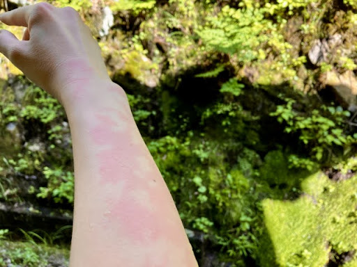 特徴としては、赤いまだら模様が肩・腕・脚など皮膚の広い部分に現れ、熱い・かゆいなどの感覚はほとんどありません。